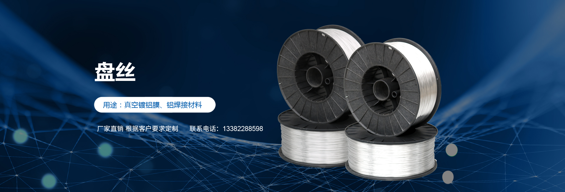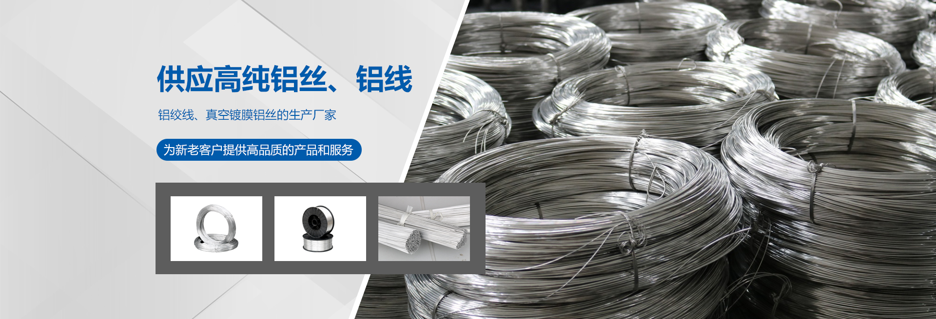 高純度鋁絲:公司主打產品。SGS認證產品,適用于真空鍍鋁。純度99.9%。可為客戶量身定做生產的各盤裝鋁絲。產品應用領域十分廣泛,如:真空鍍鋁膜、電器儀表、電子、家電業、電線電纜業、建筑裝飾業、五金裝飾業、IT電腦業、廣告裝飾業、醫療器械、工藝制品、防腐制品(大型港口、橋梁、碼頭)、食品包裝容器、紡織服裝等。